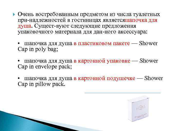 Очень востребованным предметом из числа туалетных при надлежностей в гостиницах является апочка для ш душа. Сущест вуют следующие предложения упаковочного материала для дан ного аксессуара: • шапочка для душа в пластиковом пакете — Shower Cap in poly bag; • шапочка для душа в картонной упаковке — Shower Cap in envelope pack; • шапочка для душа в картонной подушечке — Shower Cap in pillow pack.