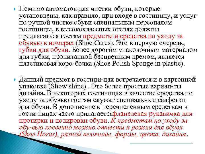 Помимо автоматов для чистки обуви, которые установлены, как правило, при входе в гостиницу, и услуг по ручной чистке обуви специальным персоналом гостиницы, в высококлассных отелях должны предлагаться гостям предметы и средства по уходу за обувью в номерах (Shoe Cares). Это в первую очередь, губки для обуви. Более дорогим упаковочным материалом для губки, пропитанной бесцветным кремом, является пластиковая коро бочка (Shoe Polish Sponge in plastic). Данный предмет в гостини цах встречается и в картонной упаковке (Show shine). Это более простые вариан ты дизайна. В некоторых гостиницах в качестве средства по уходу за обувью гостям служат специальные салфетки для обуви. В дополнение к перечисленным средствам в гости ницах часто прилагается ланелевая рукавичка для ф протирки и полировки обуви. К предметам по уходу за обу вью косвенно можно отнести и рожки для обуви (Shoe Horns), разной величины, формы, цвета, дизайна.