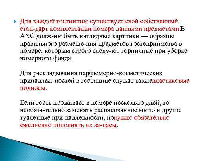 Для каждой гостиницы существует свой собственный стан дарт комплектации номера данными предметами. В АХС долж ны быть наглядные картинки — образцы правильного размеще ния предметов гостеприимства в номере, которым строго следу ют горничные при уборке номерного фонда. Для раскладывания парфюмерно косметических принадлеж ностей в гостинице служат также ластиковые п подносы. Если гость проживает в номере несколько дней, то необяза тельно заменять распакованное мыло и другие туалетные при надлежности, но ужно обязательно н ежедневно пополнять их за пасы.