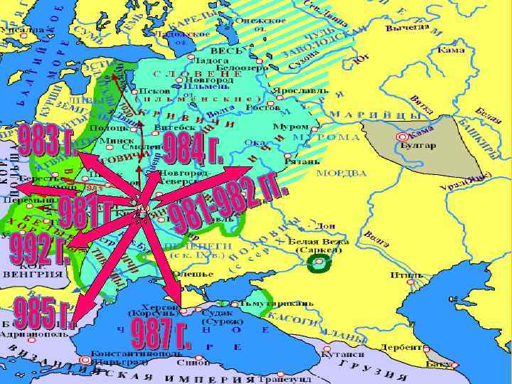 В 987 г. Владимир захватил центр Крымских владений Византии – Херсонес, получив удобную базу для последующих нападений на империю. Император Василий II вынужден был выполнить свои обещания – отдать в жены Владимиру свою сестру Анну. Князь же здесь принял христианство по греческому образцу.