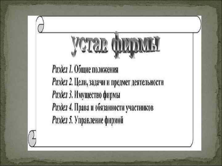 Имущество фирмы • размер уставного капитала (складочного капитала, уставного фонда) предпринимательской фирмы; • порядок пополнения уставного капитала фирмы и увеличения (или уменьшения) размеров ее имущества; размер доли каждого из участников фирмы в имуществе и уставном капитале фирмы, а также порядок перераспределения указанных долей (для фирм, созданных на основе долевой собственности на средства производства). Права и учредителей фирмы обязанности и участников • права участников и учредителей фирмы в управлении делами фирмы и в распределении прибыли и убытков фирмы; • имущественные и иные обязательства участников фирмы; • правила и порядок вхождения в состав участников фирмы и выхода из него, в том числе правила продажи доли в имуществе фирмы и приобретения такой доли;