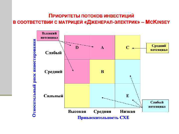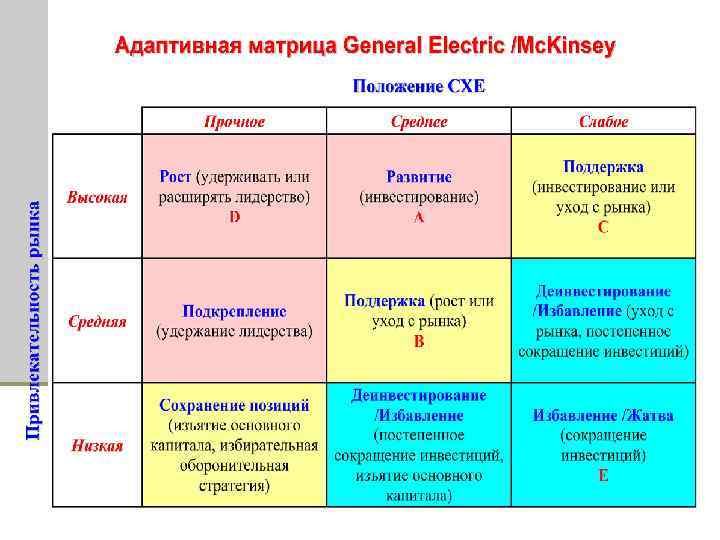 Матрица прогнозируемых рисков и рыночного роста Относительный прогнозируемый рост Быстрый рост Относительный прогнозируемый риск инвестирования Стабильность Падение Невысокий Наступление Удержание Средний Наступление Удержание Отступление Высокий Удержание Отступление рования