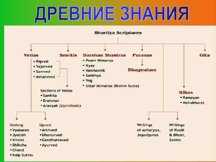 Ригведа- Знание о Гимнах, 10859 стихов “Есть лишь одна истина, только люди по-разному ее описывают. “ Яджурведа – Знание о Литургии, 3988 стихов Самаведа- Знание о классической музыке, 1549 стихов Аюрведа- Знание о медицине, более 100 000 стихов Упанишады разбирают Ведическую философию; формируют выводы для каждой из Вед. «Они повествуют нам, о том, как душа (Атман) может соединиться с абсолютной истиной (Брахман) посредством созерцания и медитации, а также посредством доктрины Кармы – совокупного результата поступков человека» . Они обучают: Джйотиш – Астрология и астрономия. Дханур Веда– Наука о стрельбе из лука и Калпа – Ритуалы и правовые вопросы. военном деле. Сикша – Фонетика. Мундака – Дисциплина, Вера и Айтарея – Создание Вселенной, Человек ипредупреждение невежества. Эволюция. Сулба сутра – Знание о математике Чандогйа – Реинкарнация, душа. Йога сутра - Знание о Медитации Каушитаки – Карма. Кама сутра- Знание о любви и сексе Кена – Аскетизм, работа и самообладание.