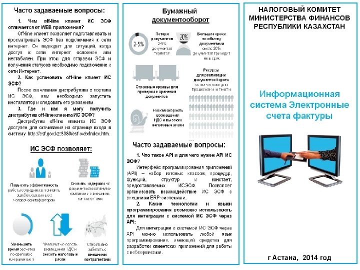 Преимущества Гарантия быстрой доставки Счета фактуры моментально передаются адресату, не покидая сервера системы ЭСФ Юридическая значимость Каждый счет подписывается электронной цифровой подписью Защита информации Работа в системе осуществляется по защищённым каналам, с использованием средств криптографической защиты Доступность Система ЭСФ функционирует 24 часа в сутки, 7 дней в неделю по адресу www. esf. gov. kz Простота использования Отправлять счета через ЭСФ так же просто, как отправлять письма по электронной почте: в системе реализован простой и интуитивно понятный интерфейс; Интеграция Система ЭСФ постоянно совершенствуется, а также может быт интегрирована с другими учетными бухгалтерскими системами Ключевые характеристики Работа в режиме 24/7. ИС ЭСФ позволяет мгновенно обмениваться электронными юридически значимыми документами без необходимости дублирования на бумаге. Разработан в строгом соответствии с Налоговым Кодексом Республики Казахстан, а также другими нормативно-правовыми актами РК. При отправке бумажных документов каждая компания подвержена рискам потери, кражи или утечки информации. ЭСФ позволяет минимизировать эти риски и несет ответственность за безопасность передаваемых документов. Три способа подачи данных: • Web-интерфейс (ввод на портале) • Web-интерфейс (пакетная загрузка) • Толстый клиент (интеграция) Первый вариант: посредством WEBпортала по адресу: www. esf. gov. kz рекомендуется для малых предприятий, выписывающих небольшое количество ЭСФ; Второй вариант: через WEB-портал посредством пакетной обработки данных – для средних компаний; Третий вариант: интеграция ИС ЭСФ с ERP системами налогоплательщика посредством API интерфейса – для крупных компаний, обрабатывающих более миллиона счетов одновременно. В ИС ЭСФ используется единый формат передачи данных – xml-формат. Для корректной работы с ИС ЭСФ можно использовать следующие Интернетбраузеры: - Internet Explorer версии 7 и выше; Opera версии 9 и выше; - Mozilla Firefox версии 4 и выше; - Safari версии 5 и выше; - Google. Chrome. Часто задаваемые вопросы: 1. Что такое сертификат Национального удостоверяющего центра (НУЦ) и где его можно получить? Сертификат НУЦ это сертификат ключа электронной подписи, необходим для аутентификации (авторизации) в ИС ЭСФ, а также подписания электронных документов в ИС ЭСФ. Сертификат НУЦ можно получить в Центрах Регистрации Национального Удостоверяющего центра размещенных при Центрах Обслуживания Населения в городах Астана, Алматы и во всех областных центрах и городах Республики Казахстан. Подробные инструкции по получению сертификатов доступны на официальном сайте НУЦ РК: - инструкции по получению сертификатов для физических лиц: http: //pki. gov. kz/index. php/ru/fizicheskie-litsa; инструкции по получения сертификатов для юридических лиц: http: //pki. gov. kz/index. php/ru/yuridicheskielitsa. 2. Какие операции доступны в системе для юридического лица; Для юридического лица в системе ИС ЭСФ доступен следующий операции: • просмотр Счета-фактуры; • создание нового Счета-фактуры; • создание исправленного Счетафактуры; • создание дополнительного Счетафактуры; • отзыв Счета-фактуры, создание черновика; • создание копии Счета-фактуры; • поиск Счета-фактуры; • импорт/экспорт Счета фактуры; • управление полномочиями сотрудников ЮЛ.