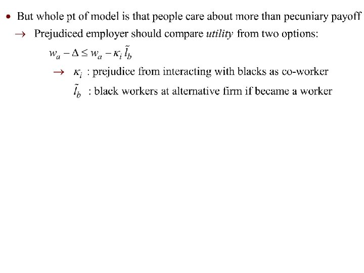 Two Specification Issues § Non-employment: Big Racial Differences in LFP. Wages for workers differentially reflect market wages black and white workers can command. § Firm Size Differences. Unprejudiced firms may be larger because of lower costs. Marginal would thus be smaller than pth percentile. § Similar reasoning if there are black entrepreneurs… “Unprejudiced” firms effectively larger.