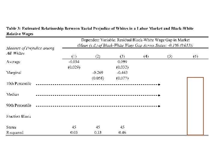 Labor Market Prejudice and Wage Gaps § Merge Prejudice indices to Current Population Survey (CPS) § § Estimate Relationship Between Market Wages and Prejudice in Two Steps. § § 1973 -1978 May 1979 -2002 Merged Outgoing Rotation Group Compute hourly wage for full-time men, 16 -64 Estimate regression of log wages on education, quadratic in exp, race*year effects, black dummy for each state. Take estimated black dummies (there are 45 because some states not identified in GSS) and regress those on measures of prejudice. Weight by the precision of the wage-gap estimate. Why this way? § § § Alternative all in one step. Log wages on X, black dummy, and interaction between black dummy and prejudice measure. Since variation in prejudice all at state, standard errors may be too small. Turns out not to matter.