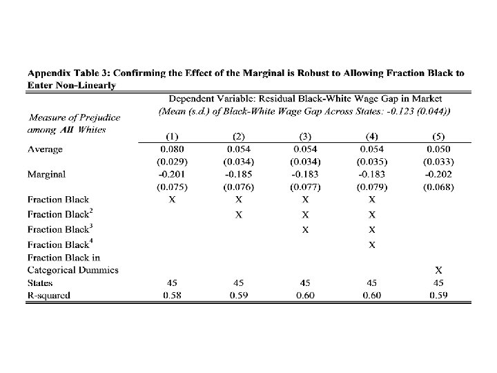 Robustness Check 2: Marginal Computed as 0. 8 times pth percentile. [Katz/Murphy estimates of elasticity of substitution of -1. 5 between high and low skill workers, and black-white wage gap of about 0. 2 log pts, implies that if all of gap caused by prejudice, need 0. 77 of them relative to constant firm size case. ]