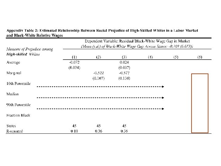 Empirical implications 1. Since whether a person is an “employer” or “worker” is endogenous, relevant distribution of prejudice is among whites overall 2. Holding racial preferences in the market constant, increases in fraction of workforce that is black should lead to lower black wages 3. Because market induces sorting/segregation, left tail of prejudice distribution should matter for wage gaps § Median and right tail of racial preference distribution should not matter for wage gaps 4. If segregation is key, more integrated labor markets should have larger wage gaps
