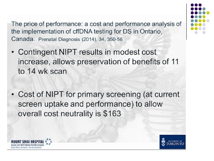Large-scale study in unselected population NEJM, April 2015 N=15, 841 pregnancies Routine screening T 21 Harmony Test Sens= 100% (38 of 38) FPR= 0. 06% PPV= 80. 9%