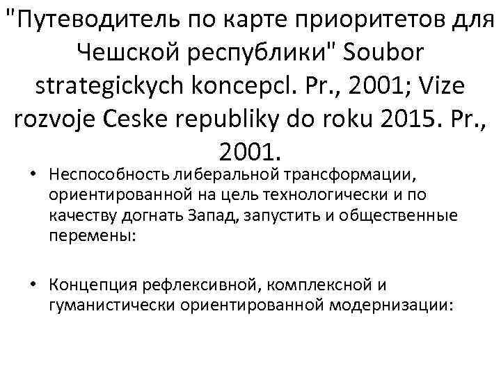 "Путеводитель по карте приоритетов для Чешской республики" Soubor strategickych koncepcl. Pr. , 2001; Vize rozvoje Ceske republiky do roku 2015. Pr. , 2001. • Неспособность либеральной трансформации, ориентированной на цель технологически и по качеству догнать Запад, запустить и общественные перемены: • Концепция рефлексивной, комплексной и гуманистически ориентированной модернизации: