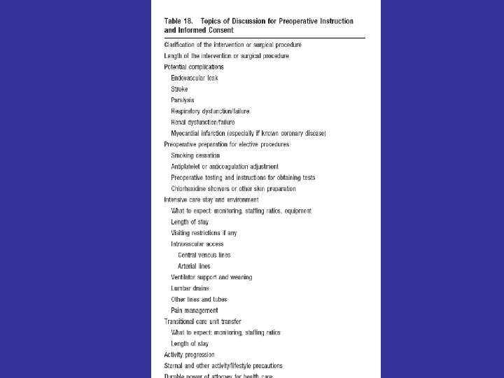 Recommendations for Preoperative Evaluation Class I • 1. In preparation for sx, imaging studies extent of disease and planned procedure. (Level of Evidence: C) • 2. Pts with thoracic aortic dis. requiring a sx or catheter-based intervention who have symptoms or other findings of myocardial ischemia should Ix : significant CAD (Level of Evidence: C) • 3. Pts with unstable coronary syndromes and significant CAD should undergo revascularization prior to or at the time of thoracic aortic sx or endovascular intervention with percutaneous coronary intervention or concomitant CABG. (Level of Evidence: C)