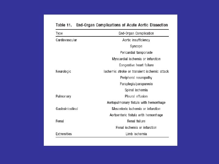 Acute aortic syndrome 1. 2. 3. 4. 5. 6. 7. 8. 9. Perfusion Deficits and End-Organ Ischemia Acute aortic regurgitation Myocardial Ischemia or Infarction Heart Failure and Shock Pericardial Effusion and Tamponade Syncope Neurologic Complications Pulmonary Complications Gastrointestinal Complications