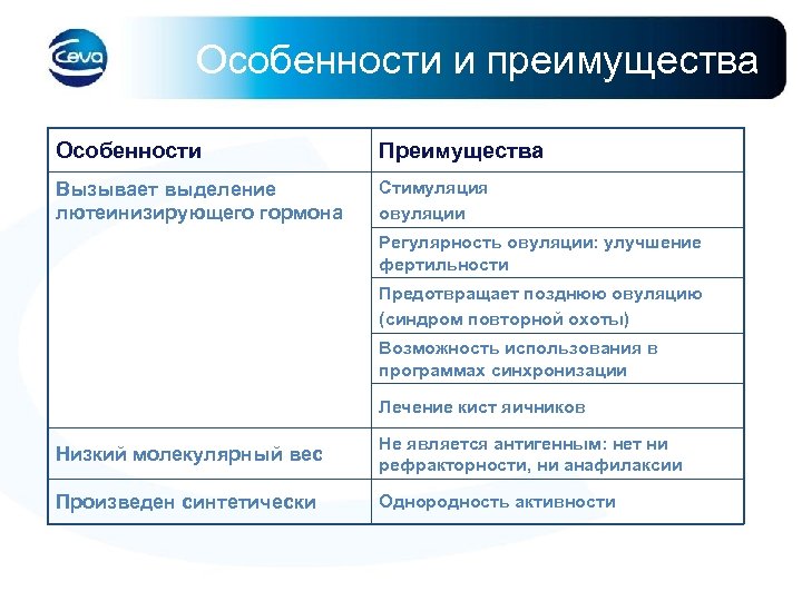 Особенности и преимущества Особенности Преимущества Вызывает выделение лютеинизирующего гормона Стимуляция овуляции Регулярность овуляции: улучшение фертильности Предотвращает позднюю овуляцию (синдром повторной охоты) Возможность использования в программах синхронизации Лечение кист яичников Низкий молекулярный вес Не является антигенным: нет ни рефракторности, ни анафилаксии Произведен синтетически Однородность активности