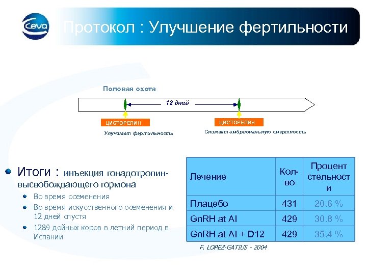 Протокол : Улучшение фертильности Половая охота 12 дней ЦИСТОРЕЛИН Улучшает фертильность Итоги : инъекция гонадотропинвысвобождающего гормона Во время осеменения Во время искусственного осеменения и 12 дней спустя 1289 дойных коров в летний период в Испании ЦИСТОРЕЛИН Снижает эмбриональную смертность Лечение Процент Колстельност во и Плацебо 431 20. 6 % Gn. RH at AI 429 30. 8 % Gn. RH at AI + D 12 429 35. 4 % F. LOPEZ-GATIUS - 2004