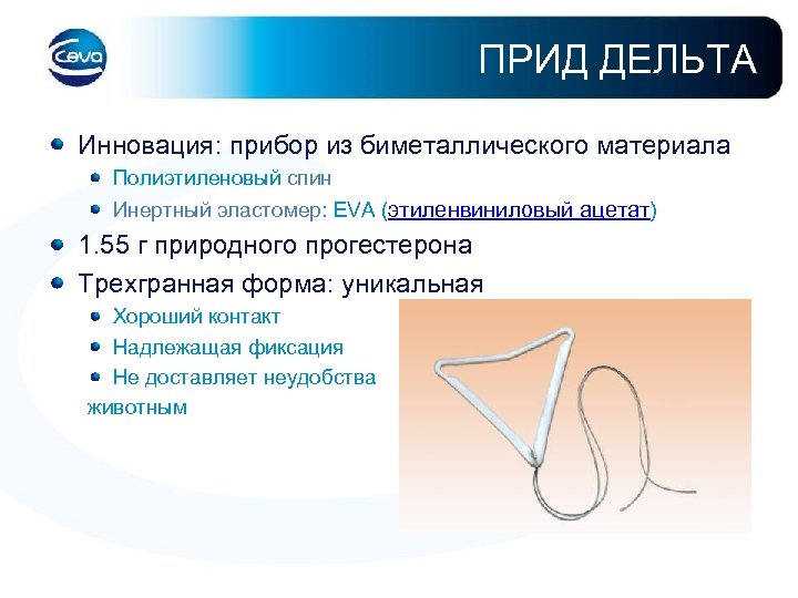 ПРИД ДЕЛЬТА Инновация: прибор из биметаллического материала Полиэтиленовый спин Инертный эластомер: EVA (этиленвиниловый ацетат) 1. 55 г природного прогестерона Трехгранная форма: уникальная Хороший контакт Надлежащая фиксация Не доставляет неудобства животным
