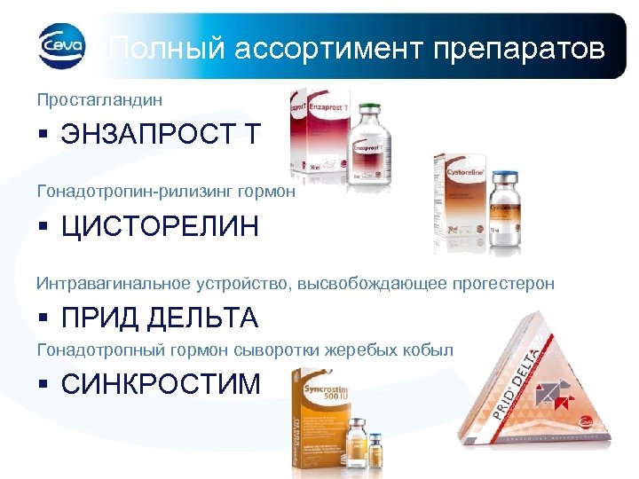 Полный ассортимент препаратов Простагландин § ЭНЗАПРОСТ Т Гонадотропин-рилизинг гормон § ЦИСТОРЕЛИН Интравагинальное устройство, высвобождающее прогестерон § ПРИД ДЕЛЬТА Гонадотропный гормон сыворотки жеребых кобыл § СИНКРОСТИМ