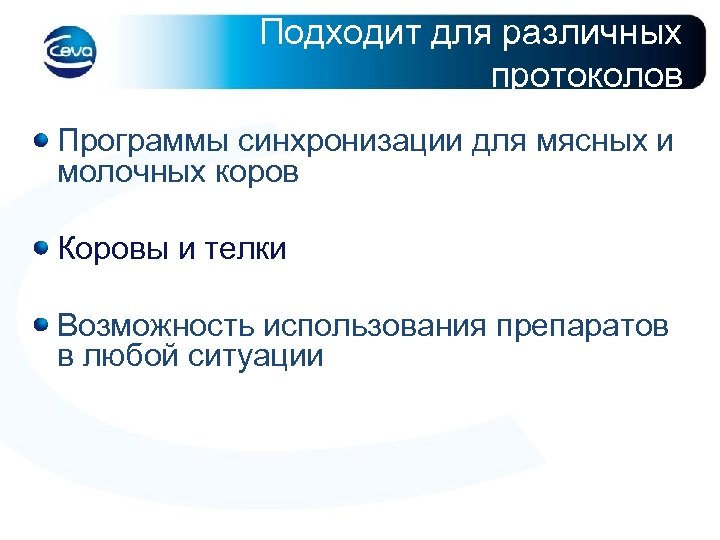 Подходит для различных протоколов Программы синхронизации для мясных и молочных коров Коровы и телки Возможность использования препаратов в любой ситуации