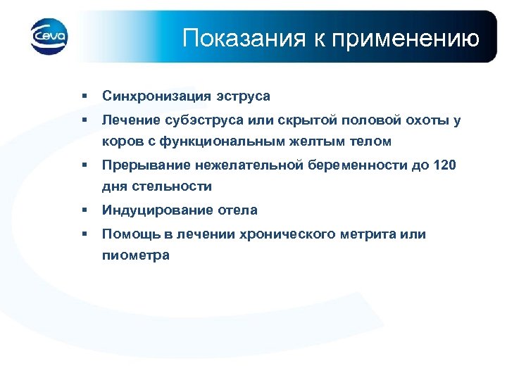 Показания к применению § Синхронизация эструса § Лечение субэструса или скрытой половой охоты у коров с функциональным желтым телом § Прерывание нежелательной беременности до 120 дня стельности § Индуцирование отела § Помощь в лечении хронического метрита или пиометра