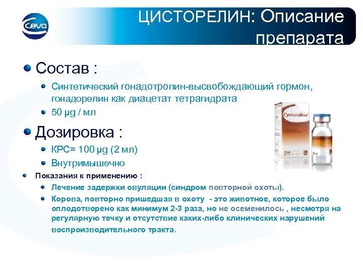 ЦИСТОРЕЛИН: Описание препарата Состав : Синтетический гонадотропин-высвобождающий гормон, гонадорелин как диацетат тетрагидрата 50 µg / мл Дозировка : КРС= 100 µg (2 мл) Внутримышечно Показания к применению : Лечение задержки овуляции (синдром повторной охоты). Корова, повторно пришедшая в охоту - это животное, которое было оплодотворено как минимум 2 -3 раза, но не осеменилось , несмотря на регулярную течку и отсутствие каких-либо клинических нарушений воспроизводительного тракта.