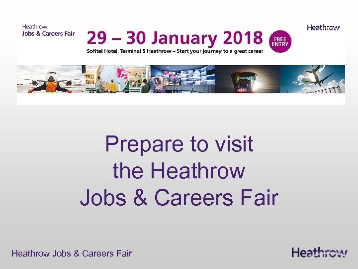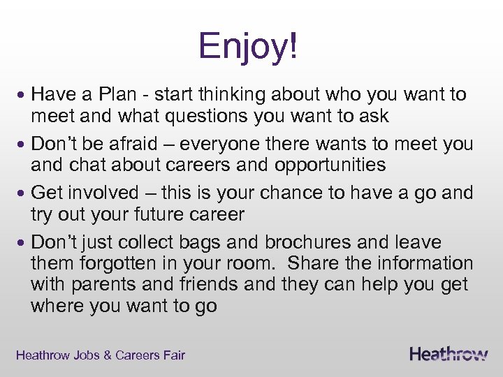 Enjoy! Have a Plan - start thinking about who you want to meet and what questions you want to ask Don’t be afraid – everyone there wants to meet you and chat about careers and opportunities Get involved – this is your chance to have a go and try out your future career Don’t just collect bags and brochures and leave them forgotten in your room. Share the information with parents and friends and they can help you get where you want to go Heathrow Jobs & Careers Fair