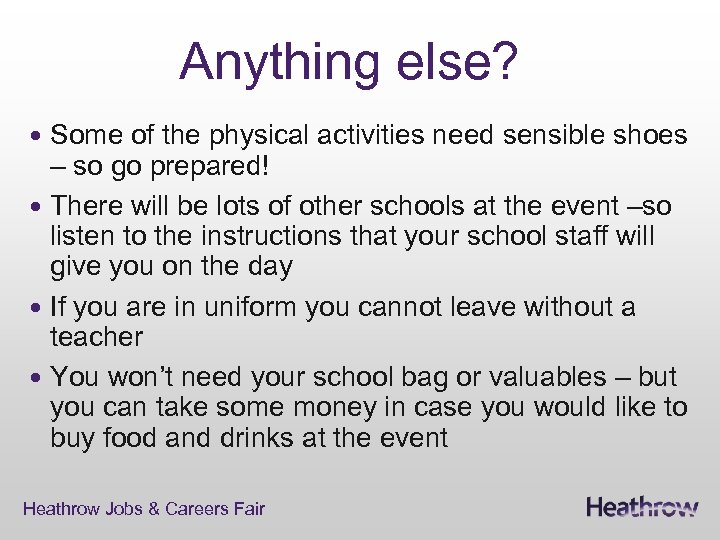 Anything else? Some of the physical activities need sensible shoes – so go prepared! There will be lots of other schools at the event –so listen to the instructions that your school staff will give you on the day If you are in uniform you cannot leave without a teacher You won’t need your school bag or valuables – but you can take some money in case you would like to buy food and drinks at the event Heathrow Jobs & Careers Fair