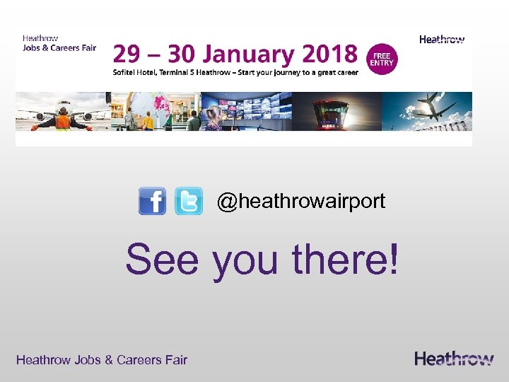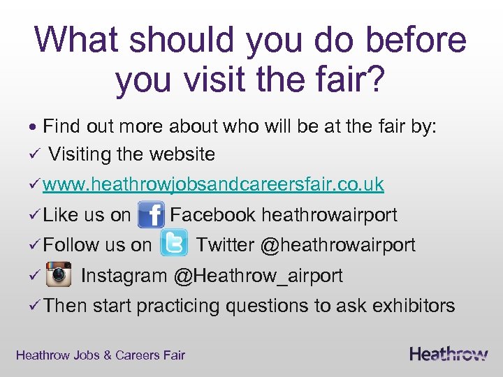 What should you do before you visit the fair? Find out more about who will be at the fair by: ü Visiting the website ü www. heathrowjobsandcareersfair. co. uk ü Like us on Facebook heathrowairport ü Follow us on ü Twitter @heathrowairport Instagram @Heathrow_airport ü Then start practicing questions to ask exhibitors Heathrow Jobs & Careers Fair