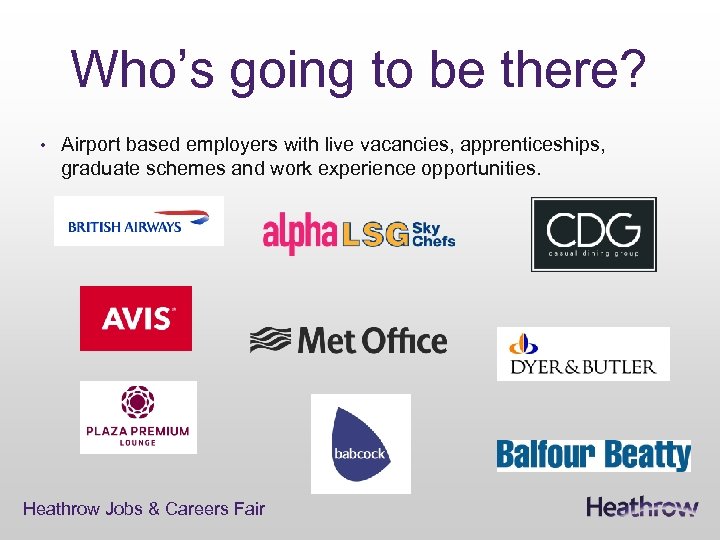 Who’s going to be there? • Airport based employers with live vacancies, apprenticeships, graduate schemes and work experience opportunities. Heathrow Jobs & Careers Fair