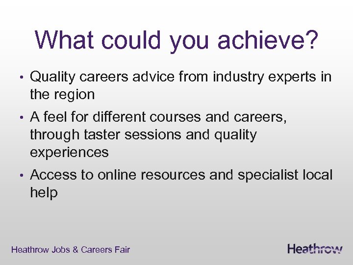 What could you achieve? • Quality careers advice from industry experts in the region • A feel for different courses and careers, through taster sessions and quality experiences • Access to online resources and specialist local help Heathrow Jobs & Careers Fair
