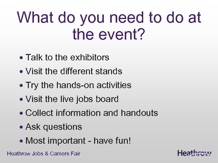 What do you need to do at the event? Talk to the exhibitors Visit the different stands Try the hands-on activities Visit the live jobs board Collect information and handouts Ask questions Most important - have fun! Heathrow Jobs & Careers Fair
