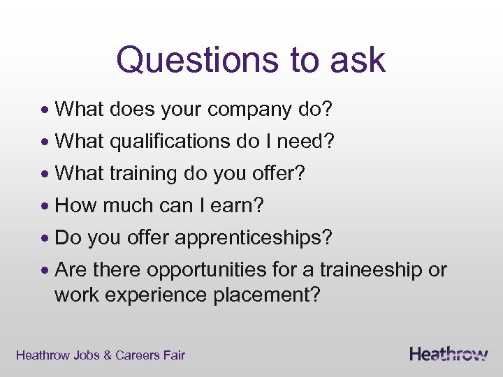 Questions to ask What does your company do? What qualifications do I need? What training do you offer? How much can I earn? Do you offer apprenticeships? Are there opportunities for a traineeship or work experience placement? Heathrow Jobs & Careers Fair