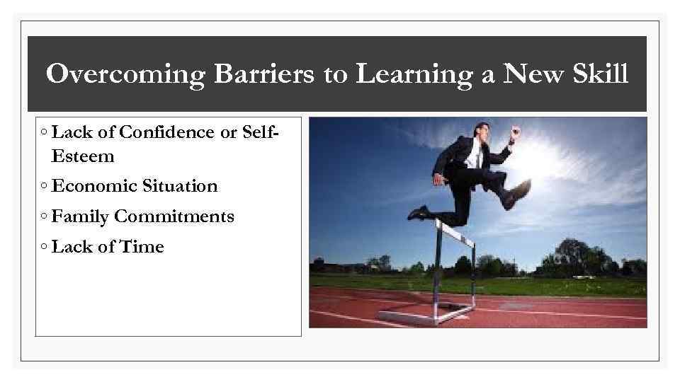 Overcoming Barriers to Learning a New Skill ◦ Lack of Confidence or Self. Esteem ◦ Economic Situation ◦ Family Commitments ◦ Lack of Time
