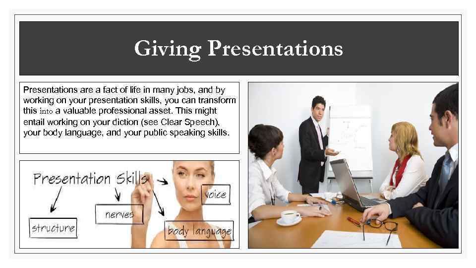 Giving Presentations are a fact of life in many jobs, and by working on your presentation skills, you can transform this into a valuable professional asset. This might entail working on your diction (see Clear Speech), your body language, and your public speaking skills.