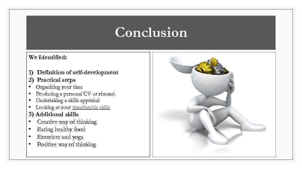Conclusion We Identified: 1) Definition of self-development 2) Practical steps • • Organizing your time Producing a personal CV or résumé. Undertaking a skills appraisal Looking at your transferable skills 3) Additional skills • Creative way of thinking • Eating healthy food • Exercises and yoga • Positive way of thinking