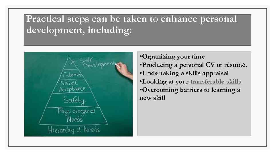 Practical steps can be taken to enhance personal development, including: • Organizing your time • Producing a personal CV or résumé. • Undertaking a skills appraisal • Looking at your transferable skills • Overcoming barriers to learning a new skill