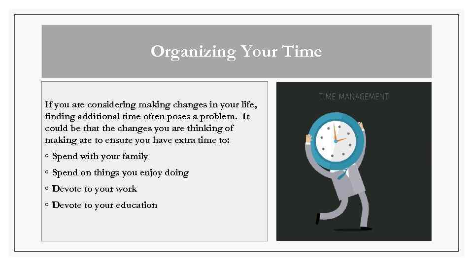 Organizing Your Time If you are considering making changes in your life, finding additional time often poses a problem. It could be that the changes you are thinking of making are to ensure you have extra time to: ◦ Spend with your family ◦ Spend on things you enjoy doing ◦ Devote to your work ◦ Devote to your education