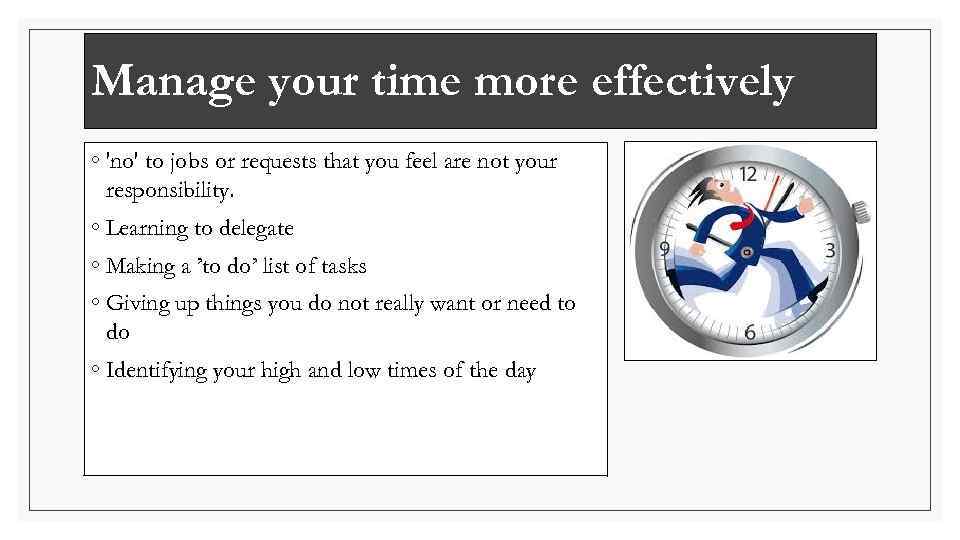 Manage your time more effectively ◦ 'no' to jobs or requests that you feel are not your responsibility. ◦ Learning to delegate ◦ Making a ’to do’ list of tasks ◦ Giving up things you do not really want or need to do ◦ Identifying your high and low times of the day