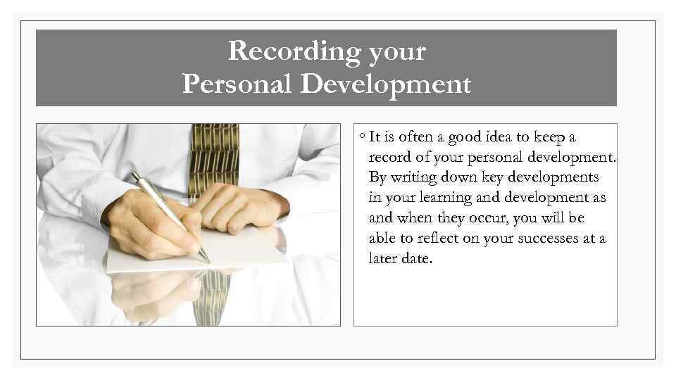 Recording your Personal Development ◦ It is often a good idea to keep a record of your personal development. By writing down key developments in your learning and development as and when they occur, you will be able to reflect on your successes at a later date.