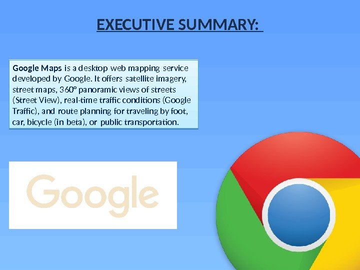 EXECUTIVE SUMMARY: Google Maps is a desktop web mapping service developed by Google. It ofers satellite imagery, street maps, 360° panoramic views of streets (Street View), real-time traffic conditions (Google Traffic), and route planning for traveling by foot, car, bicycle (in beta), or public transportation.