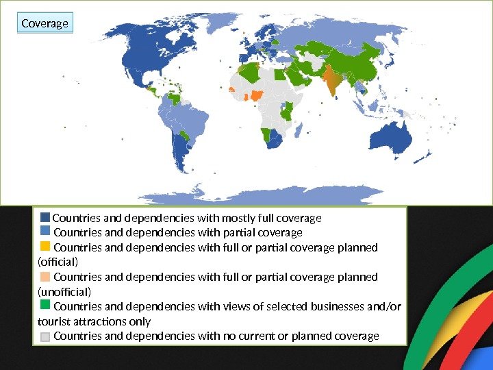 Countries and dependencies with mostly full coverage Countries and dependencies with partial coverage Countries and dependencies with full or partial coverage planned (official) Countries and dependencies with full or partial coverage planned (unofficial) Countries and dependencies with views of selected businesses and/or tourist attractions only Countries and dependencies with no current or planned coverage. Coverage