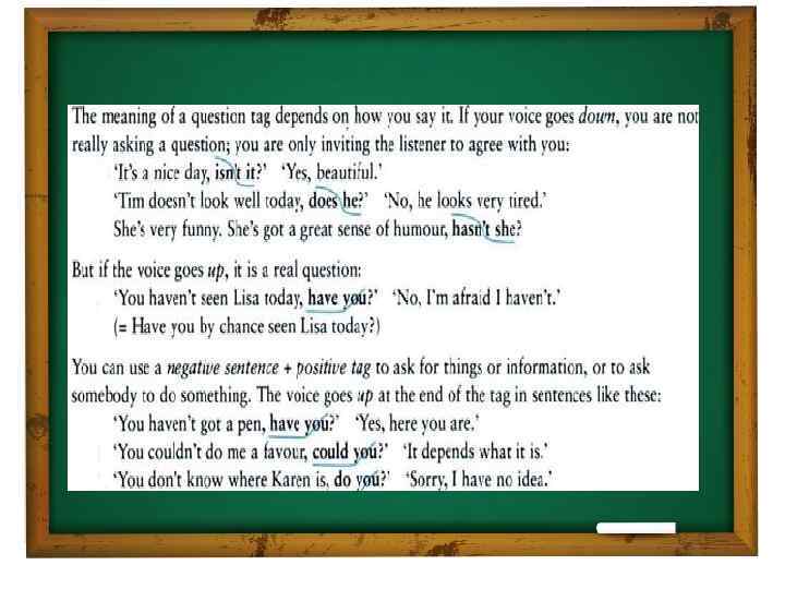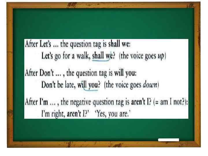 A tag question is a special construction in English. It is a • A tag question is a special construction in English. It is a statement followed by a ministatement followed question. whole sentence question. The whole sentence is is a a "tag question", and the mini"tag question", the end is called a question at and the mini"question tag". question at the end is called a "question tag".