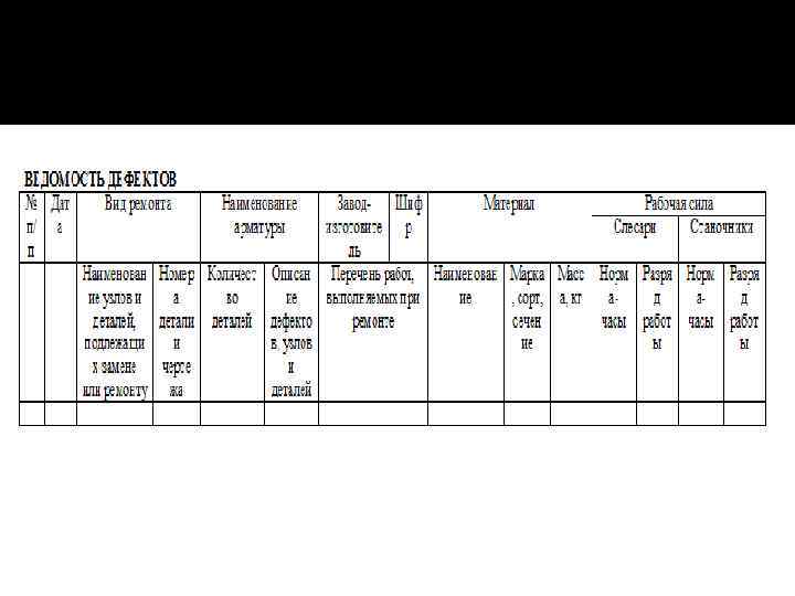 5. Составление ведомости дефектов В ведомости дефектов подробно перечисляются дефекты арматуры в целом, каждого узла в отдельности и каждой детали, подлежащей восстановлению и упрочнению. Правильно составленная и достаточно подробная ведомость дефектов является существенным дополнением к технологическим процессам ремонта, поэтому этот весьма ответственный документ обычно составляет технолог по ремонту при участии бригадира ремонтной бригады, мастера ремонтного цеха и представителя цеха - заказчика. После составления ведомости дефектов начинается ее конструктивная проработка и выдача чертежей для проведения ремонта. Ведомость дефектов (таблица) является исходным техническим и финансовым документом.