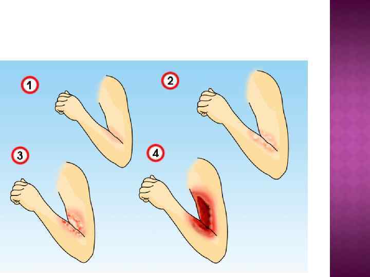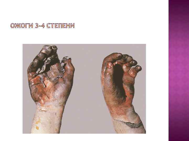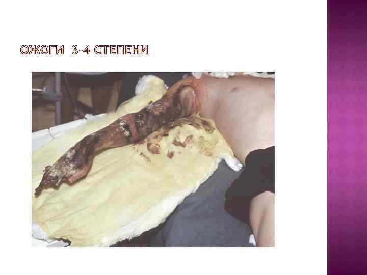 Классификация. По глубине поражения выделяют 4 степени: ст. - поражаются поверхностные слои эпидермиса. 2 ст. - поражается весь эпидермис. 3 а ст. - поражается эпидермис и поверхностные слои дермы. Зб ст. - поражается вся кожа до подкожной клетчатки. 4 ст. - поражается кожа и глубжележащие ткани. Ожоги 1. 2 и 3 а степени относят к поверхностным, кожный покров при них восстанавливается самостоятельно. Ожоги 3 б и 4 степени – глубокие и требуют оперативного лечения (некрэктомия, аутодермопластика).
