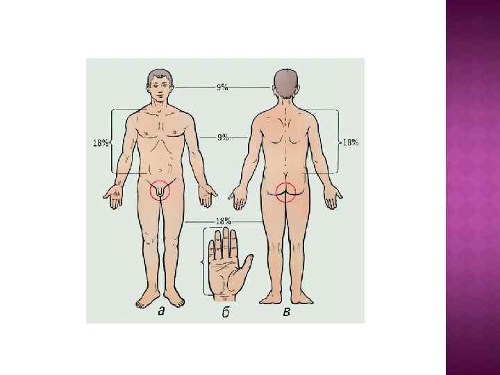 Термический ожог – это повреждение тканей, вызванное воздействием высокой температуры. Тяжесть состояния пострадавшего зависит от глубины и площади ожога. Для определения площади ожоговых ран используют: - правило ладони (м-д Глумова) - площадь ладони равна 1% тела. правило девяток (м-д Уоллеса) - голова и шея 9%, верхиие конечности-18%, нижние конечности- 36%, грудь и живот-18%, спина и ягодицы-18%, промежность-1%. - метод Постникова – на ожоговую поверхность накладывают стерильный целлофан и контуры ожогов обводят красителем (бриллиантовый зеленый, йод и т. д), затем целлофан перемещают на миллиметровую бумагу и вычисляют площадь. - таблицы Лунда- Браудера - используют для определения площади ожоговой поверхности у детей с учетом возрастных пропорций их тела.