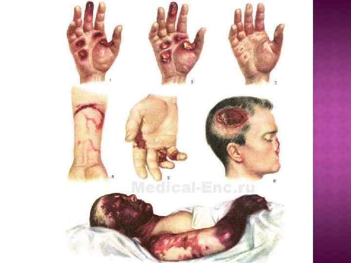 3. Ожоговая септикотоксемия. Начинается с момента нагноения ожоговой раны (все ожоговые раны инфицируются) и длится до нескольких месяцев. Тяжесть состояния обусловлена поступлением в кровеносное русло не только продуктов распада тканей, но и микробных токсинов. Отмечается выраженная интоксикация: температура до 40, постоянная или ремиттирующая; адинамия, апатия, анорексия (которая приводит к ожоговому истощению – больной теряет до 4 -5 кг в неделю); могут формироваться пролежни, присоединяться осложнения - сепсис, пневмония, токсический гепатит, почечная недостаточность и т. д. В ОАК нарастает анемия, воспалительные изменения. Для лечения применяются антибиотики, дезинтоксикационная терапия, иммунокоррекция, посиндромная терапия.