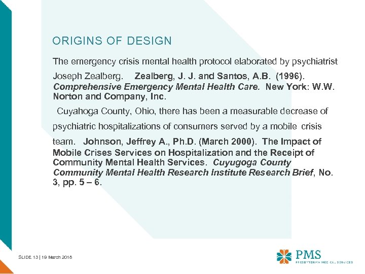 ORIGINS OF DESIGN The emergency crisis mental health protocol elaborated by psychiatrist Joseph Zealberg, J. J. and Santos, A. B. (1996). Comprehensive Emergency Mental Health Care. New York: W. W. Norton and Company, Inc. Cuyahoga County, Ohio, there has been a measurable decrease of psychiatric hospitalizations of consumers served by a mobile crisis team. Johnson, Jeffrey A. , Ph. D. (March 2000). The Impact of Mobile Crises Services on Hospitalization and the Receipt of Community Mental Health Services. Cuyugoga County Community Mental Health Research Institute Research Brief, No. 3, pp. 5 – 6. SLIDE 13 | 19 March 2018