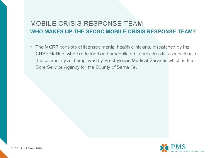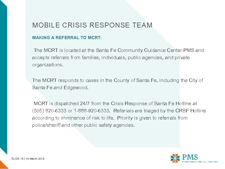 MOBILE CRISIS RESPONSE TEAM MAKING A REFERRAL TO MCRT: The MCRT is located at the Santa Fe Community Guidance Center-PMS and accepts referrals from families, individuals, public agencies, and private organizations. The MCRT responds to cases in the County of Santa Fe, including the City of Santa Fe and Edgewood. MCRT is dispatched 24/7 from the Crisis Response of Santa Fe Hotline at (505) 820 -6333 or 1 -888 -920 -6333. Referrals are triaged by the CRSF Hotline according to imminence of risk to life. Priority is given to referrals from police/sheriff and other public safety agencies. SLIDE 18 | 19 March 2018