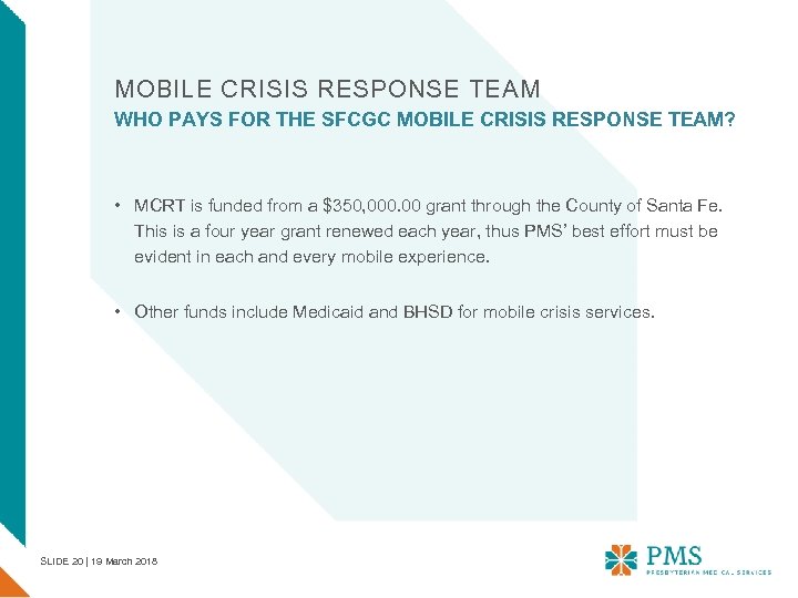 MOBILE CRISIS RESPONSE TEAM WHO PAYS FOR THE SFCGC MOBILE CRISIS RESPONSE TEAM? • MCRT is funded from a $350, 000. 00 grant through the County of Santa Fe. This is a four year grant renewed each year, thus PMS’ best effort must be evident in each and every mobile experience. • Other funds include Medicaid and BHSD for mobile crisis services. SLIDE 20 | 19 March 2018