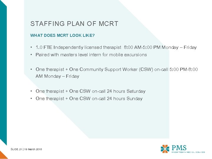 STAFFING PLAN OF MCRT WHAT DOES MCRT LOOK LIKE? • 1. 0 FTE Independently licensed therapist 8: 00 AM-5: 00 PM Monday – Friday • Paired with masters level intern for mobile excursions • One therapist + One Community Support Worker (CSW) on-call 5: 00 PM-8: 00 AM Monday – Friday • One therapist + One CSW on-call 24 hours Saturday • One therapist + One CSW on-call 24 hours Sunday SLIDE 21 | 19 March 2018