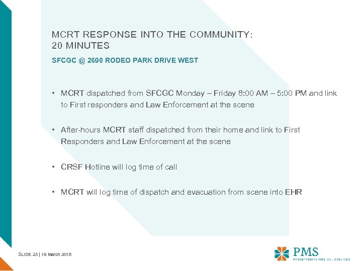 STAFFING PLAN OF MCRT WHAT DOES MCRT LOOK LIKE? • All MCRT staff are already employees of PMS • Credentialed with PMS and Health Insurance Agencies • Privileged by PMS; able to perform specific clinical services • Enter data into Electronic Health Record (EHR) • Vested into the PMS model of helping behavioral health consumers in the community by working at a community health center. • Agree with a continuum of service delivery via increasing community tenure and linkage to services • Benefits include: enhancing skills in crisis services, awarded 20 Continuing Education Units (CEUs), on-call stipend and crisis pay for dispatch SLIDE 22 | 19 March 2018
