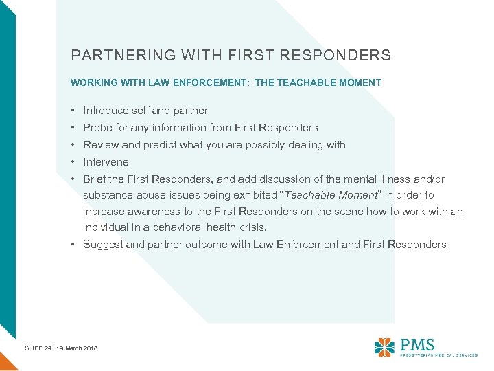 PARTNERING WITH FIRST RESPONDERS WORKING WITH LAW ENFORCEMENT: THE TEACHABLE MOMENT • Introduce self and partner • Probe for any information from First Responders • Review and predict what you are possibly dealing with • Intervene • Brief the First Responders, and add discussion of the mental illness and/or substance abuse issues being exhibited “Teachable Moment” in order to increase awareness to the First Responders on the scene how to work with an individual in a behavioral health crisis. • Suggest and partner outcome with Law Enforcement and First Responders SLIDE 24 | 19 March 2018
